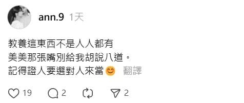 1日,高國豪大嫂率先在社群平台發文,寫下:「教養這東西不是人人都有,美美那張嘴別給我胡說八道,記得證人要選對人來當。」