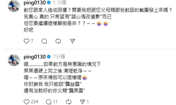 江祖平在連串發文中還提到,「對您跟家人造成困擾?需要我把跟您父母親跟我對話截圖放上來嗎?」強調自己希望看到的是「誠心悔改道歉」,並對對方顛倒是非的態度表達不滿。