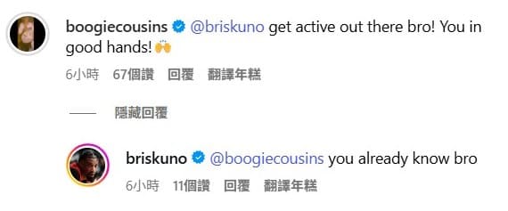 值得一提的是,前雲豹洋將卡森斯在貼文留言給麥卡洛打氣:「兄弟,在場上動起來啊!你很安全、有人罩著你!」麥卡洛也回覆:「你早就知道的啦,兄弟!」