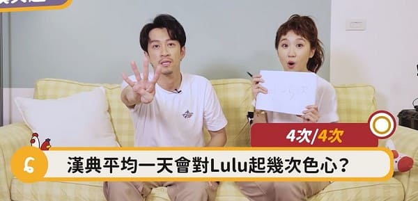 藝人Lulu(黃路梓茵)與陳漢典閃電宣布婚訊,震撼演藝圈。隨著喜訊曝光,一支5年前的節目影片近日被網友挖出,片中兩人展開默契大考驗,題目包含「Lulu上次月經來是什麼時候?」以及「漢典平均一天會對Lulu起幾次色心?」等私密問題。陳漢典不僅清楚記得時間點,還自曝答案是「4次」,解釋因為節目一天錄4次,才會有「起色心」的說法,令Lulu當場大笑。