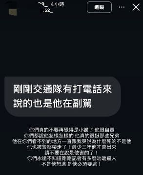 該則貼文另指,車禍起因於郭姓駕駛飲酒,加上缺乏駕駛經驗,情緒慌張下將煞車誤踩成油門,最終高速衝撞工地釀禍。她強調,目前謝姓少年已返回警局並遭收押,後續將等待開庭及相關鑑定結果出爐。