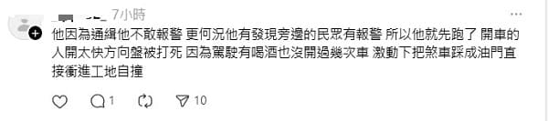 她也提到,謝少年因身上有通緝在身,不敢報警,當下見有民眾報案才選擇逃離,他更直接寫道「不是他想逃,是他必須要逃!」
