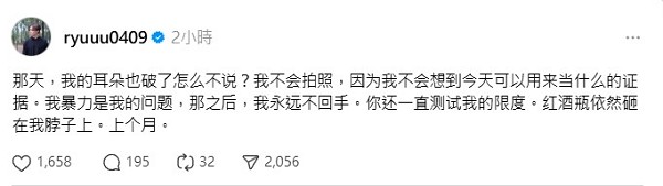 對此一名Ryu的友人也在貼文底下留言證實:「作為身邊的朋友,一起吃飯的時候有注意到 ryu 臉上的傷,雖然 ryu 你沒有特別拍照,但身邊的人都有看到的,不是當事人的自己其他我就不多說了。」