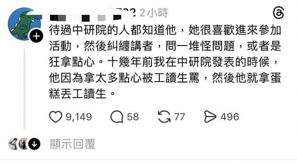 影片發布後,有網友爆料指出該名阿婆早已有多次爭議行為:「待過中研院的人都知道她,她很喜歡進來參加活動,然後糾纏講者,問很多奇怪問題,甚至拿點心丟工讀生。」