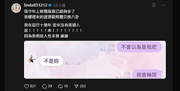 而在貼文曝光後,被質疑就是內鬼的琳妲也發文澄清:「我今年上新聞版面已經夠多了,我哪裡來的資源跟媒體交換八卦,我在這行十幾年 從來沒有害過人,從!!!!!來!!!!!!!!,因為我相信人性本善,謝謝」。