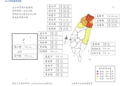 交通部中央氣象署表示,受東北季風及颱風「風神」外圍環流共同影響,今(20)日上午桃園以北降雨明顯,下半天起強降雨區域將往宜蘭縣及北花蓮山區擴展,局部地區可能出現豪雨或大豪雨。氣象單位提醒,民眾須注意短延時強降雨及強陣風,低窪地區慎防積淹水,山區則需留意坍方、落石、土石流及溪水暴漲。