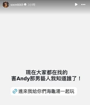 然而,晚間情勢再度翻轉。網紅孫生突然在社群發文語出驚人:「現在大家都在找的那位害Andy的男藝人,我知道是誰了。」並附上自己的Telegram連結,寫下「進來我給你們海龜湯一起玩」,暗示掌握關鍵內情。