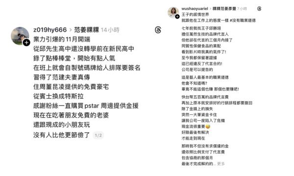 事件曝光後,不少網友開始翻出王子過往事跡並留言討論。有一名網友發文指出,早在王子就讀新民高中時期,便因錄製《模范棒棒堂》而小有名氣,甚至「在班上自製號碼牌給人排隊簽名」。該文提及王子後來入住周杰倫、昆凌提供的豪宅,並多次更換高級座駕,暗示其生活條件優渥。貼文內容最後更批評:「現在在吃著朋友免費的老婆,還跟現成的小朋友玩,沒有人比他更節儉了。」引發網友熱議。