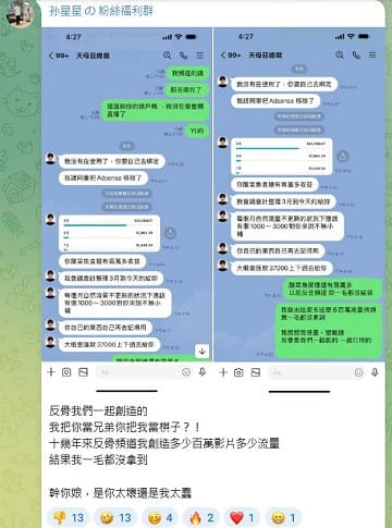 孫生在影片中情緒激動,質問酷炫:「我自己頻道的錢都去哪了?是不是都進你帳戶?」酷炫則回應,會請會計每月匯款1至3千元給他。不過聽到數字後,孫生怒批「以前反骨頻道你一毛都沒給我」,更寫下「幹你娘,是你太壞還是我太蠢」,語氣憤怒。