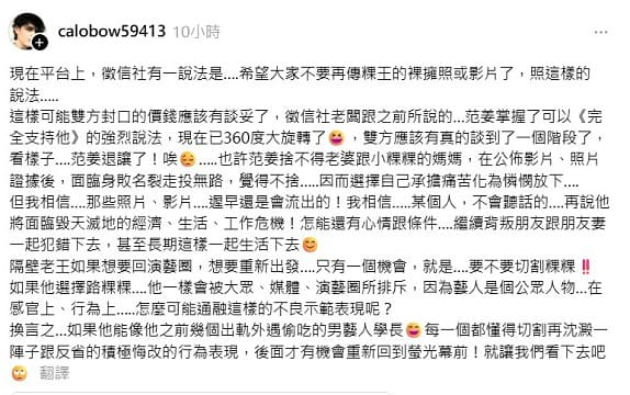 對此,一名知情人士在網路上發文爆料,指出目前的情況可能已達成初步封口協議。該人士表示,范姜掌握的證據與之前說法一致,現階段雙方已有初步協商結果,「看起來范姜選擇退讓,或許是因為不捨老婆與家庭,面對公佈影片、照片後可能帶來的身敗名裂風險,他選擇承擔痛苦,化為憐憫而放下。」