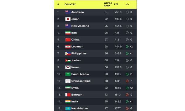 在亞洲區部分,澳洲仍以世界排名第6名穩居亞洲第一,日本以第22名緊追其後,接續依序為紐西蘭(25)、伊朗(26)、中國(27)及黎巴嫩(28),各隊排名變動幅度不大。