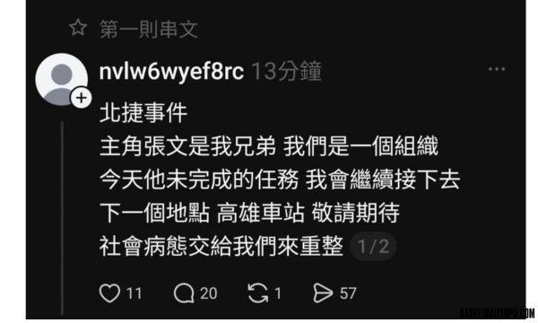 據了解,一名署名「nvlw6wyef8rc5」的Threads用戶貼文指出:「北捷事件主角張文是我兄弟,我們是一個組織,今天他未完成的任務,我會繼續接下去,下一個地點高雄車站敬請期待,社會病態交給我們來重整。」該貼文在上傳約5分鐘後即被刪除,但已被網友截圖流傳,引發網路熱議。