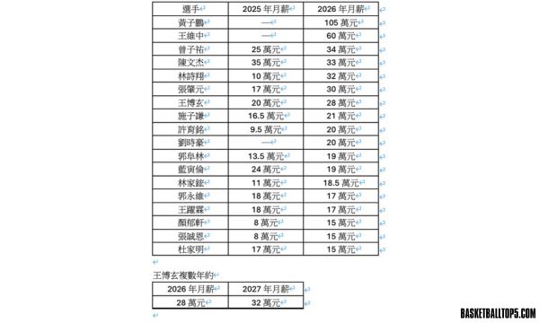 另外,林詩翔、王博玄與施子謙皆完成兩年複數約締結。王博玄的薪資分別為 2026 年 28 萬元、2027 年 32 萬元;施子謙則自 2026 年起從 16 萬 5 千元調整至 21 萬元,2027 年薪資同樣採浮動機制,將依表現進行調整。