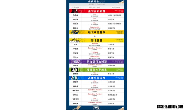 TPBL台灣職業籃球大聯盟,今日公布最新一週的傷兵報告。隨著賽季進入中後段,各隊面臨嚴峻的戰力考量,其中台北台新戰神與高雄全家海神兩隊傷情最為慘重,多名主力球員本周確定無法出賽,恐將影響本週的聯盟排名走勢。