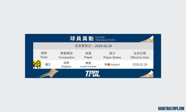 國王日前先後註銷奧帝﹐杰倫兩名洋將,根據TPBL官網消息,球團在今日重新註冊回傑登。
