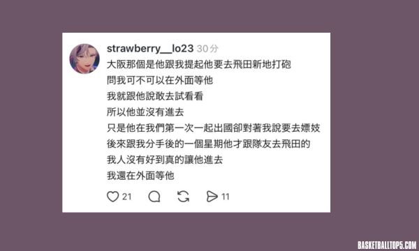 職籃球星王柏智的私生活醜聞於深夜持續引爆!前女友羅羅再度拋出震撼補充,揭露男方不僅在兩人「第一次出國」時就提出荒淫要求,甚至在分手僅短短一週後,便急不可耐地帶著隊友重返大阪紅燈區「飛田新地」尋歡。這份血淚史的深度曝光,讓全網網友背脊發涼,直呼:「這人設已經徹底報銷!」