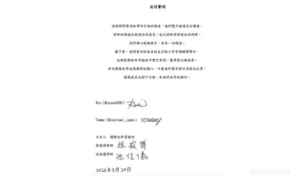 這份 147 字的聲明中提到,Ryu 與 Tommy 雙方經過充分溝通,已坦誠分享彼此的想法與感受,並取得了相互理解。聲明指出:「我們誠心祝福對方,未來一切順遂。」雙方也強調,未來將回歸各自的生活與工作步調,並期盼外界能給予空間,讓風波就此落幕,今後將不再針對私生活發聲。