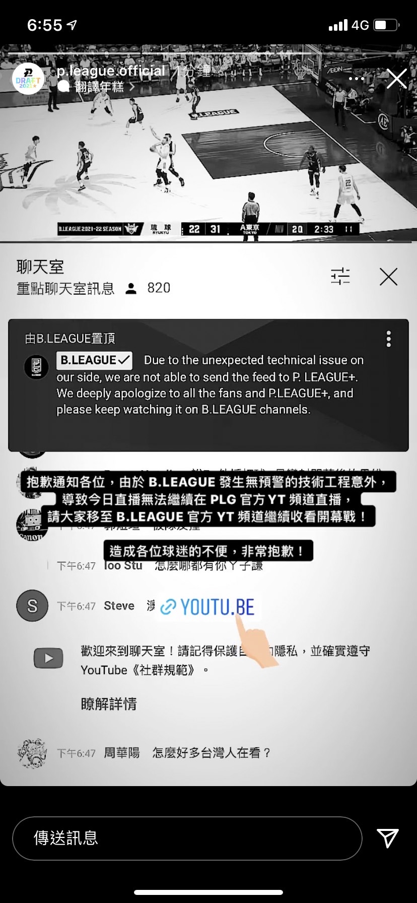 而在稍早PLG官方也發布貼文解釋狀況「抱歉通知各位,由於B.LEAGUE發生無預警的技術工程意外,導致今日直播無法繼續在PLG官方YT頻道直播。」