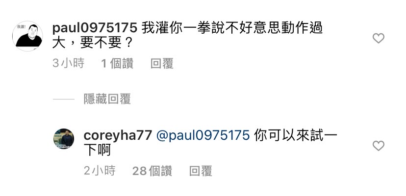 對此哈孝遠特別發文譴責周資華的行為,沒想到底下竟然有酸民帶有警告意味的回應哈孝遠「我灌你一拳說不好意思動作過大,要不要?」而哈孝遠也回復到「你可以來試一下啊」。