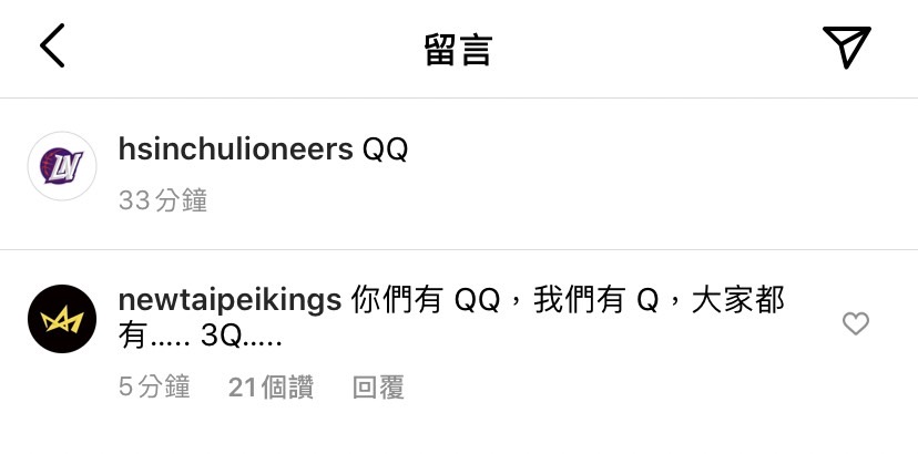 底下也湧進不少球迷留言,其中就包含已經搶下戴維斯的新北國王,國王隊小編在底下留了一則嘲諷意味極強的留言「你們有 QQ,我們有 Q,大家都有….. 3Q…..」。