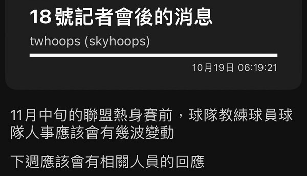 而在今日「twhoops」再發文,文章透漏鋼鐵人在11月中的聯盟熱身賽開打前,球隊教練、球員和內部人士都還會有變動,並且球團將在下周對外回應此事,至於這次消息是否正確,相信在下周就能揭曉。