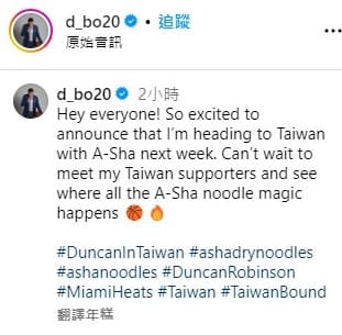 Robinson稍早在個人社群寫下「大家好,很高興宣布我下週會為了阿舍乾麵來台灣,等不及和我的台灣球迷們見面,並一起見證阿舍乾麵的魔力。」