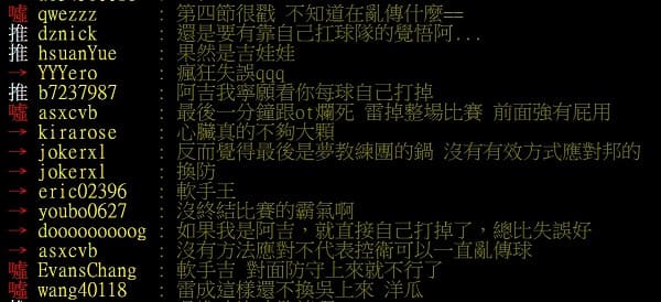 貼文底下也有網友留言「阿吉狀況越好越沒信心 問號」、「有夠雷,該絕殺時不出手,落後才勉強出手,心臟有夠小顆」、「 最後傳球判斷真的很糟,不過隊友沒上來協助接應也是」、「今天關鍵時刻很鳥= =」、「心臟真的不夠大顆」。