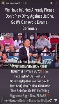 底下他又寫到「這不是籃球,我現在警告每個人就對了!!你們都可以試試看,有種就像個男人一樣面對面。」