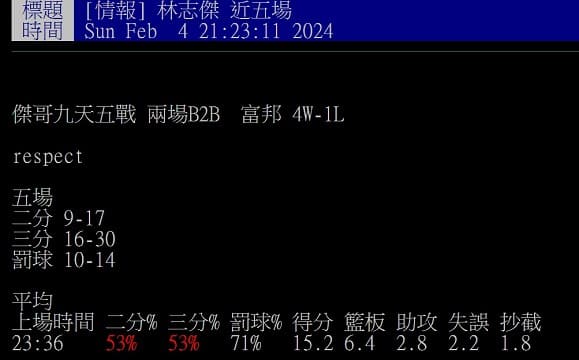 今日PTT「台籃板」上有網友整理林志傑近五戰的數據,場均出賽時間23分鐘,可以攻下15.2分、6.4籃板、2.8助攻、1.8抄截,其中兩分球和三分球命中率都高達53%,罰球命中率也有71%,已經接近180俱樂部,而在這段期間富邦打出四勝一敗的成績。