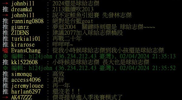 底下網友也紛紛留言寫到「2024還是球給志傑」、「小時候是球給志傑 長大也是球給志傑」、「傑哥提早進入季後賽模式了」、「台籃斷層真的太大了 20年了還是球給志傑」、「42的林書豪可能不如林志傑」。