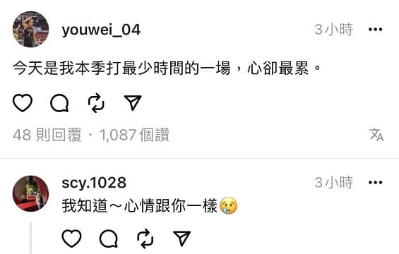值得一提的是隊友施晉堯也在貼文底下留言「我知道~心情跟你一樣」,還附上一張流淚的表情貼圖。