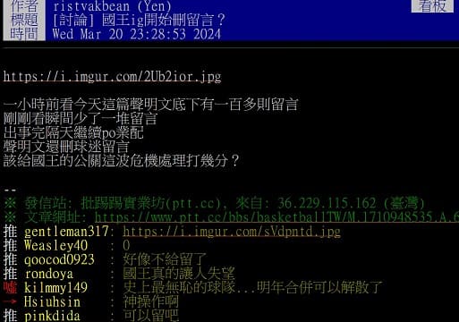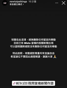 晚間有網友在PTT上發文,質疑國王刪除球迷的不滿留言,對此國王發文澄清「球團在此澄清,絕無刪除任何留言的舉動,目前已有Meta當機的相關新聞出現,可以證明團隊絕對沒有刪除任何留言的舉動。」