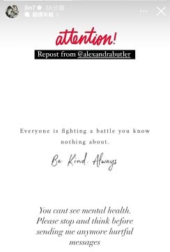 牧倫斯女友早前在個人IG發文寫到「每個人都在與你所不知的戰鬥中奮戰。善待他人。永遠如此。你看不見心理健康。請停下來,在傳送任何傷人的訊息之前三思。」