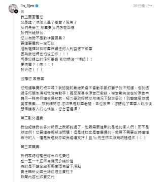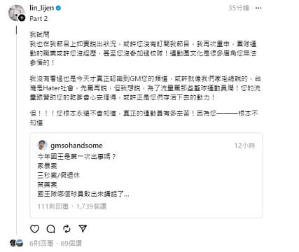 接著林力仁又發文強調自己的職籃球員身分「我試問,我也在我節目上如實說出狀況,或許您沒有訂閱我節目,我再次重申,團隊運動的職業或許您沒經歷,甚至您沒參加過校隊!運動圈文化是很多眉角您無法參悟的!」