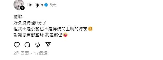 而在賽後也有網友貼出上周林力仁在社群回應網友的貼文,他寫道「抱歉… 好久沒得過0分了 但我不是公關也不是傳統閉上嘴的隊友 謝謝您喜歡籃球 我差點也」,沒想到在今天的比賽就破功,貼文底下馬上就有球迷留言「好久沒0分?這就不來了嗎」,此外這也是他本季出賽19場的比賽當中,第7場得分掛蛋。