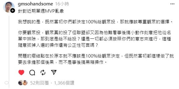 GM稍早發文直球對決,他寫道「針對近期單週MVP亂象我想說的是,既然當初你們都決定100%給觀眾投,那就應該尊重觀眾的選擇。」