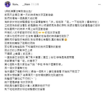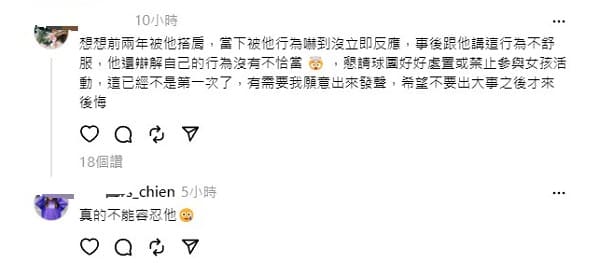 底下一名女球迷留言指證「想想前兩年被他搭肩,當下被他行為嚇到沒立即反應,事後跟他講這行為不舒服,他還辯解自己的行為沒有不恰當 ,懇請球團好好處置或禁止參與女孩活動,這已經不是第一次了,有需要我願意出來發聲,希望不要出大事之後才來後悔。」