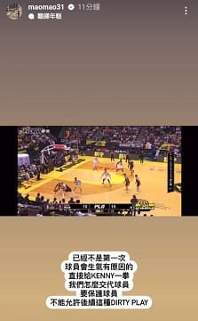 毛加恩也不滿寫到「已經不是第一次,球員會生氣有原因的,直接給KENNY一拳,我們怎麼交代球員,要保護球員,不能允許後續這種DIRTY PLAY。」