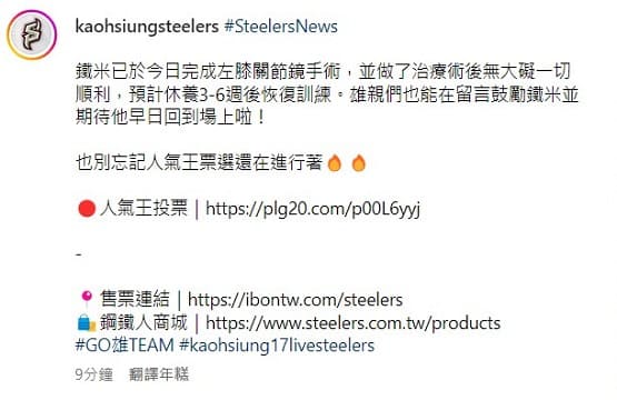 根據鋼鐵人官方消息「鐵米已於今日完成左膝關節鏡手術,並做了治療術後無大礙一切順利,預計休養3-6週後恢復訓練。雄親們也能在留言鼓勵鐵米並期待他早日回到場上啦!」