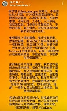 接著林書豪又寫到「我想替陳俊男說幾句,不是因為別人叫我,100%因為我要說幾句。我聽到球迷罵他,心裡很不舒服。如果他很懶,不用心打,人不好,人不單純,我就沒話說。可是他今年超級努力,不停的在練,有在進步,特別在訓練中跟我們對抗越來越好。」