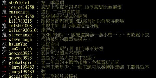 對此網友紛紛留言寫到「第二季最頂」、「感覺上預算差很多吧 這季感覺比較廉價」、「很SBL的影片,感覺濾鏡套一套小剪一下。再放鬆下去很快被別的聯盟追過去。」、「第二季應該無法超越 後面只會流於形式而已」、「沒有比對沒有傷害 這季影片完全不吸引人 很像隨便找個片段 然後找四隊錄音拍一下的大學營隊影片」。
