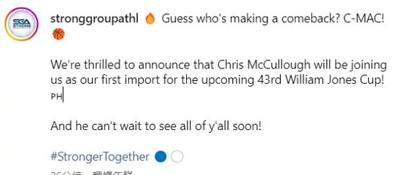 根據稍早「Strong Group」官方貼文,麥卡洛已經加入球隊,並將以洋將身分參加第43屆的威廉瓊斯盃。