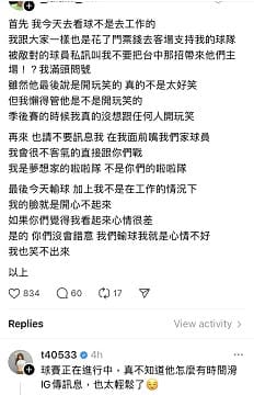 而啦啦隊隊長梓梓也回應「球賽正在進行中,真不知道他怎麼有時間滑IG傳訊息,也太輕鬆了。」