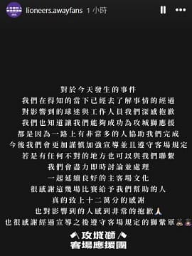 對於今天發生的事件 我們在得知的當下已經去了解事情的經過 對影響到的球迷與工作人員我們深感抱歉 我們也知道讓我們能夠成功為攻城獅應援 都是因為一路上有非常多的人協助我們完成今後 我們會更加謹慎加強宣導並且遵守客場規定 若是有任何不對的地方也可以與我們聯繫 我們會盡力即時討論並處理 一起延續良好的主客場文化 很感謝這幾場比賽給予我們幫助的人 真的致上十二萬分的感謝 也對影響到的人感到非常的抱歉 也很感謝經過宣導之後遵守客場規定的獅紫軍