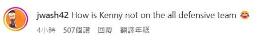 在聯盟防守第一隊的貼文底下,領航猿洋將沃許本就無奈寫道「曼尼高怎麼不在名單上」。