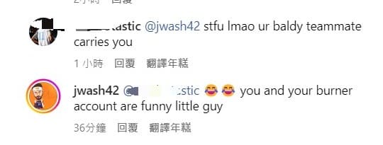 沒想到竟然有酸民留言直接嗆沃許本「閉嘴,哈哈哈,你那禿頭(指伯朗)隊友在背你。」,沃許本也不干示弱回應「你和你的小號真有趣,小家伙。」