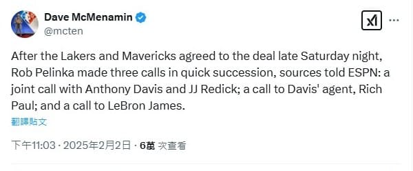 根據NBA記者Dave McMenamin報導,湖人隊的GM佩林卡(Rob Pelinka)在完成交易後快速打了三通電話。