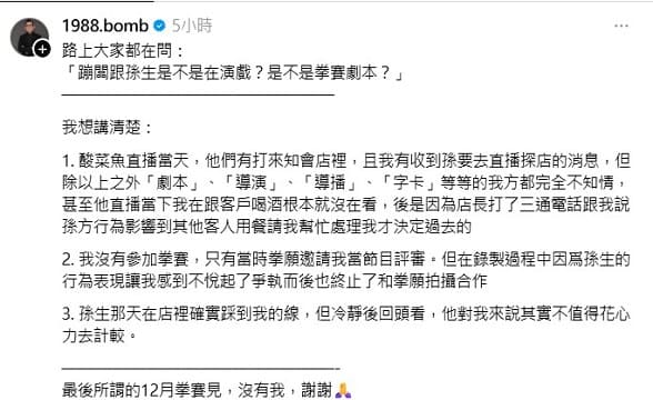 對此,蹦闆稍早發聲明駁斥,強調餐廳對「劇本」毫不知情,當時他甚至正在外應酬,是接到店長連續來電才趕回現場處理。他並澄清自己從未參與拳擊比賽,只曾受邀擔任節目評審,後因孫生的行為而終止合作。蹦闆直言:「他對我來說不值得花心力去計較。」同時否認外界流傳的「12月拳賽對決」傳言。
