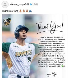 台鋼雄鷹本季奮戰到最後一刻,最終確定無緣季後賽,球隊洋砲魔鷹(Steven Moya)也正式結束2025年球季,球團也宣布他將於近日返國休息。