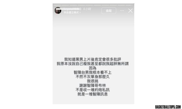 影片播出後,女方又在IG發文回應批評,內容更是火上加油。她寫道:「我知道黑男上片後我肯定會很多批評,我原本沒說自己受,我甚至都說我超胖無所謂,因為智障台男我根本看不上。不然不會單身那麼久,我很挑,謝謝智障哥布林。」此發言被網友認為極度傲慢且歧視性強。